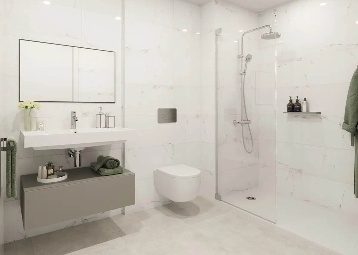 The dining, living, and kitchen areas form a single open space that integrates seamlessly into each home, reinforcing the sense of space and openness that this project offers in the heart of Fuengirola.