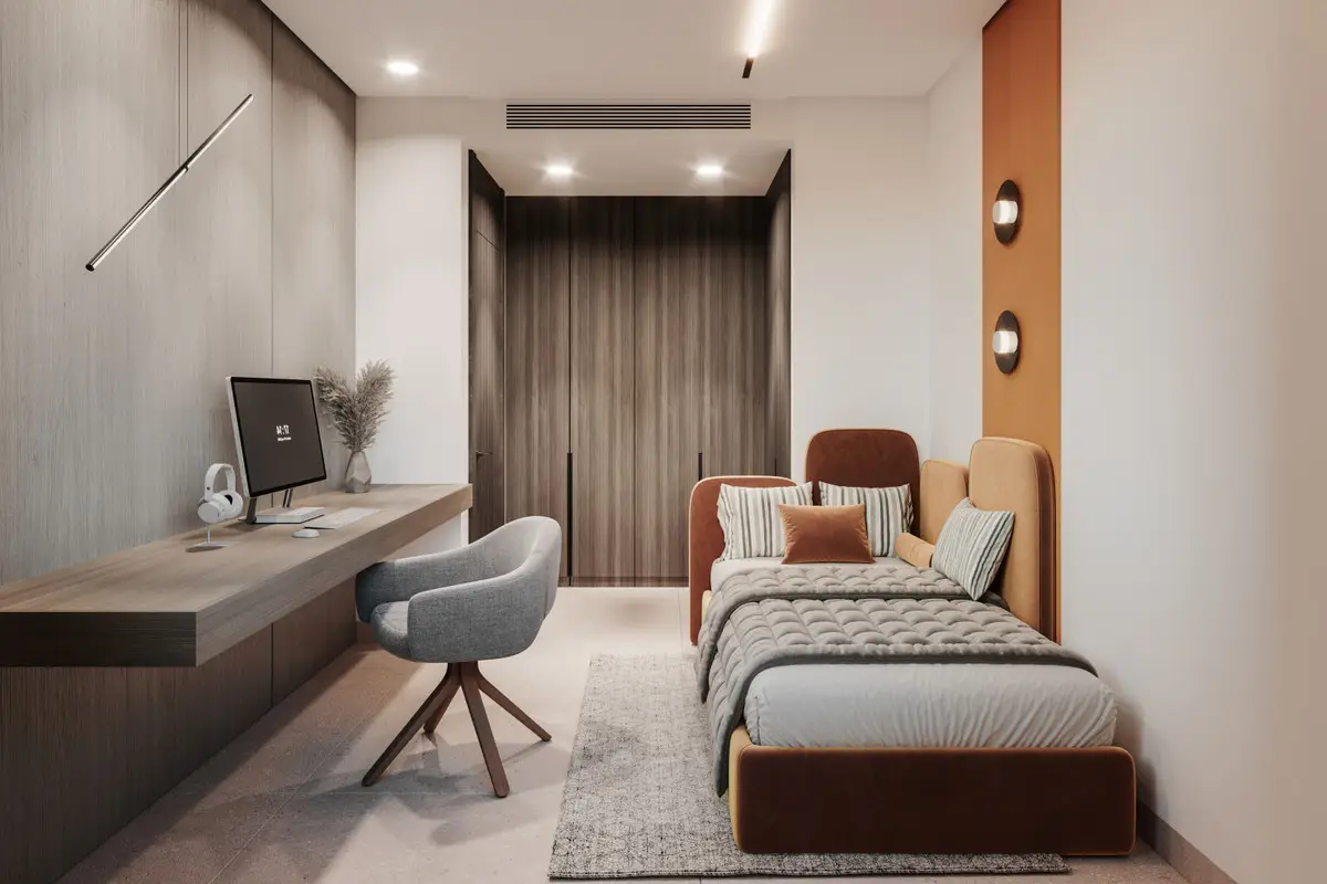 • Strefa nocna: sypialnia główna z łazienką en-suite, garderobą i prywatnym tarasem; dwie dodatkowe sypialnie z zabudowanymi szafami i wspólną łazienką w nowoczesnym, neutralnym wykończeniu.