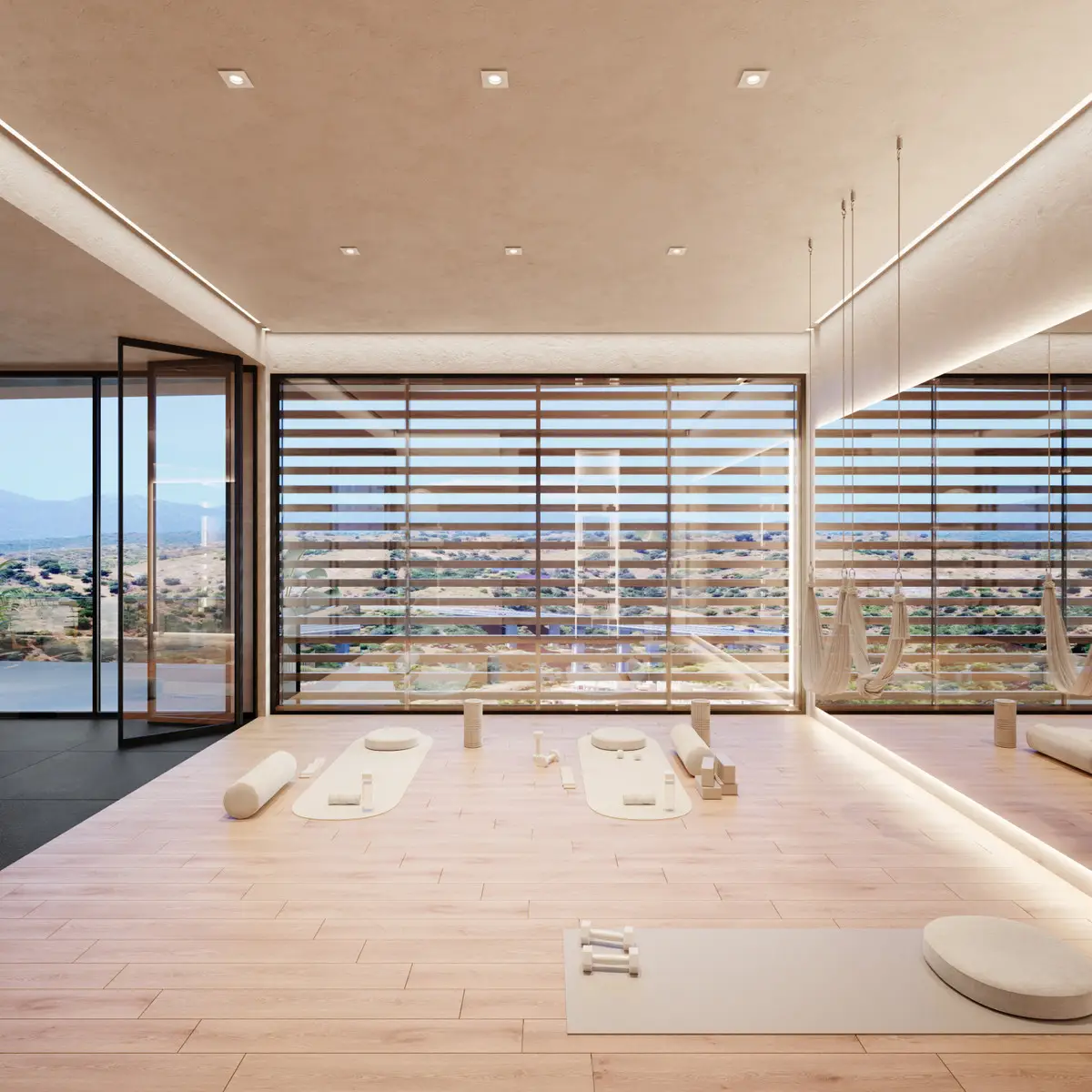 Residents benefit from a comprehensive wellness and leisure offering, including a heated semi-Olympic outdoor pool, heated indoor pool, fully equipped gym with yoga and Pilates studio, sauna, hammam, and hydrotherapy area with ice buckets. Outdoor facilities include five dedicated sports and wellness areas, multiple yoga and calisthenics zones, an outdoor bar with Balinese beds, and landscaped communal spaces. The development also features 24-hour security for peace of mind.