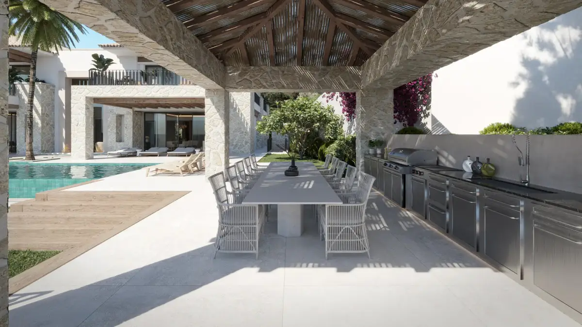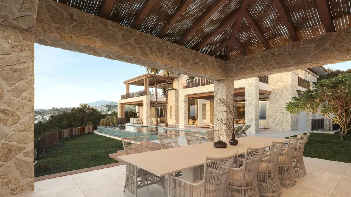 This is a majestic contemporary villa in the exclusive 24hrs double gated community of El Herrojo Alto, Marbella. The layout contains 3 floors with 8 bedrooms and 8 bathrooms, 2 of the bedrooms with private access. An open plan living space and extensive outside space, including multiple terraces and a stylish pergola equipped with an outdoor kitchen and dining area. The property has an impressive private swimming pool – and a private sports club with Tennis, Padel, Beach Volley and 5 aside Football.