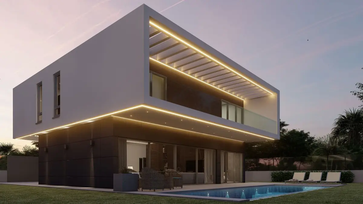 The villa has an open-plan kitchen with well-equipped modern appliances and high-quality fixtures, a stylish and functional open-planned living and dining area, and 3 spacious bedrooms with en-suite bathrooms and large windows to enjoy amazing sea views. The open floor plan and strategically positioned floor-to-ceiling windows allow natural light to flood the space and take full advantage of the scenic vistas of the Mediterranean Sea.